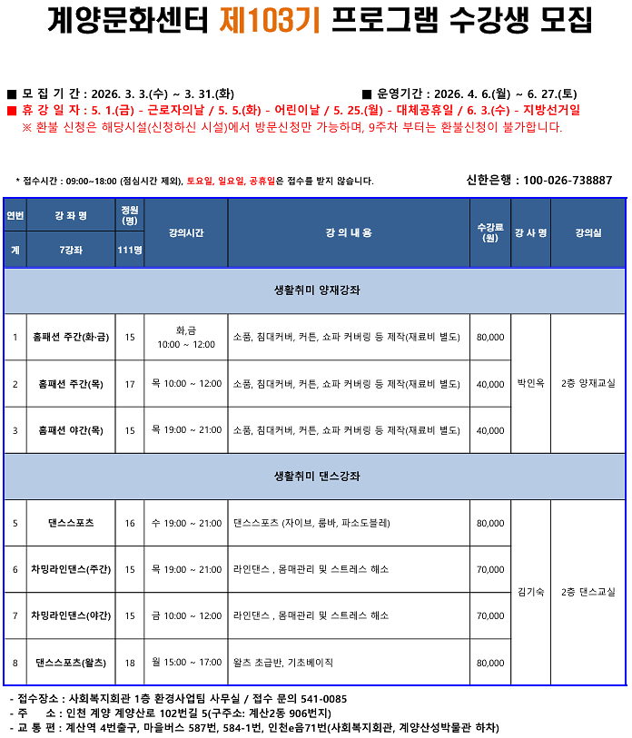 계양구청사 제103기 계양문화센터 수강생 모집